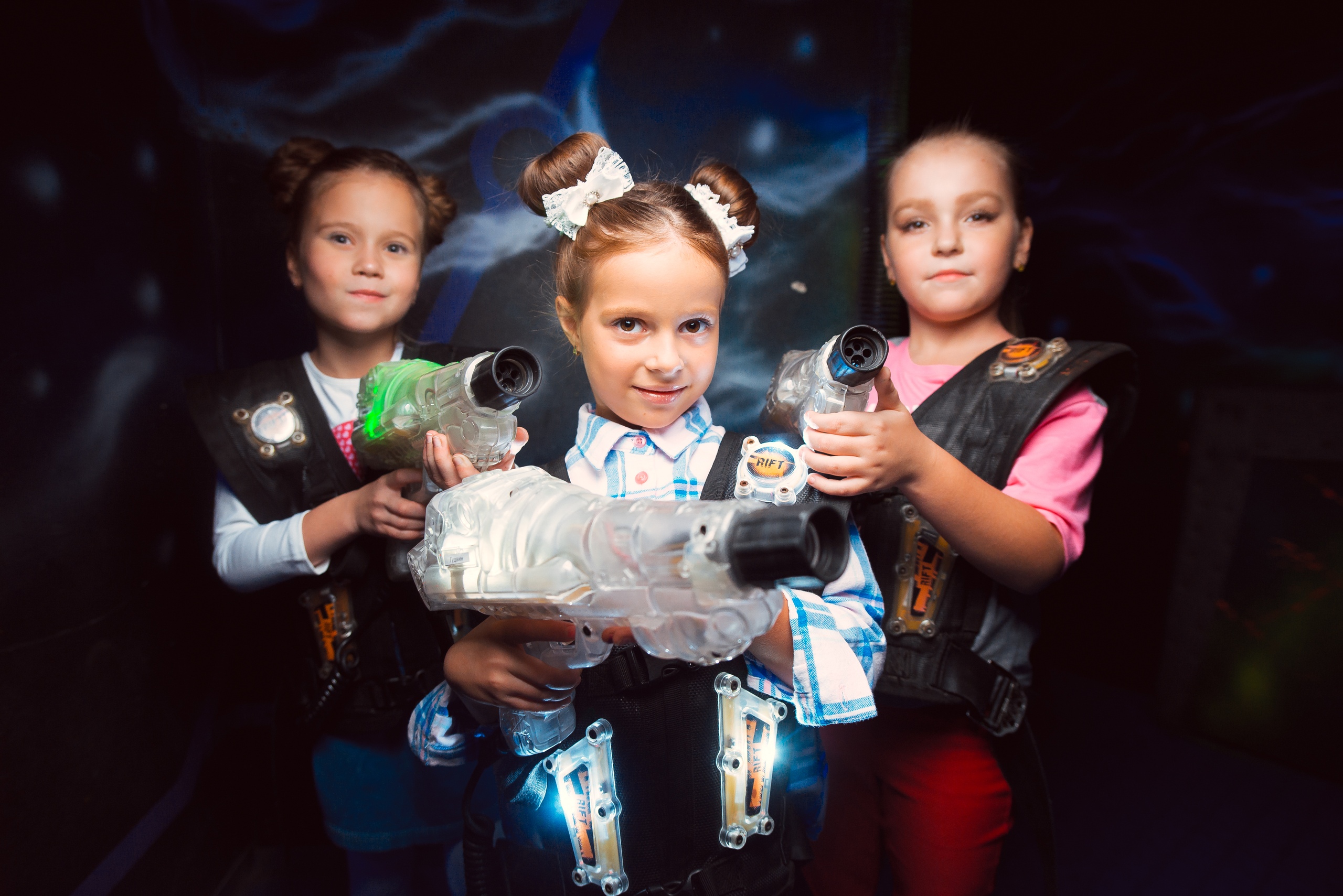 На наших праздниках гости и именинники - это девочки и мальчики. Девочки любят играть в лазертаг, не меньше мальчишек. Игра тактическая и не требует физической силы, поэтому подходит всем детям от 6 лет. Тем более вы можете выбрать один из наших лазерных квестов и ведущий программы поможет разобраться юным принцессам с игрой!