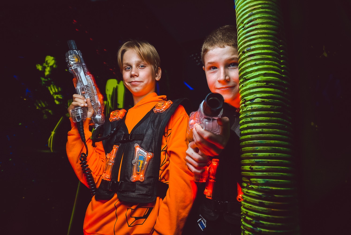 Игра в лазертаг безопасна и подходит детям от 6 лет. Задача игроков – стрелять из специального бластера по датчикам, расположенным на жилетах игрока. Принцип работы такой же, как в вашем пульте от телевизора. Между игроками не происходит физического контакта.